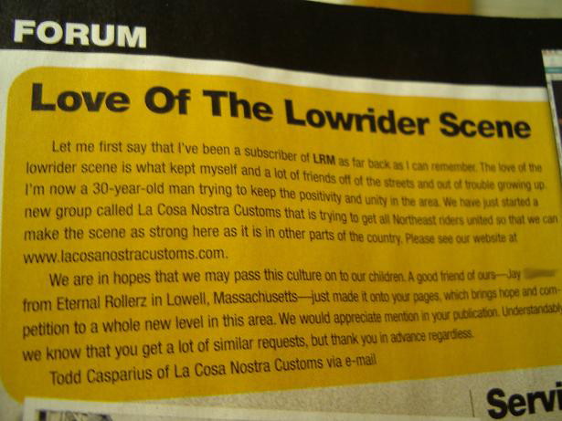 The Fourth Time Is Even Better! The February 2006 issue of LRM features a letter from Todd of La Costra Nostra Customs. We thank Todd for his kind words and mentioning us..... This issue was the fourth mention in a row of Eternal Rollerz Car Club in Lowrider Magazine. The streak ended in that issue but we promise we will grace the pages of LRM again soon!