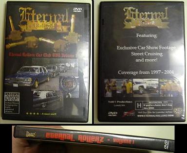 We are proud to announce our DVD release of: Eternal Rollerz Car Club : Volume 1 This one disc runs about 45-60 minutes with various footage from over the years. The disc is in two chapters. The first chapter features the older footage starting from late 1996, World of Wheels Boston, MA 1997, Summer Slam car shows in Lowell, MA from 1997 and 1998, Wakefield, MA 4th of July Parade coverage, and the 2004 Woburn, MA car show car hop and Dance. The second chapter features the MCM car show 2004 in Lowell, MA, Hanging out in parking lot, Dracut, MA car show 2004, picture slide show, and more! Available only from our MA Chapter members for $10 Donation By: Todd 1 Productions Limited Quantities! |