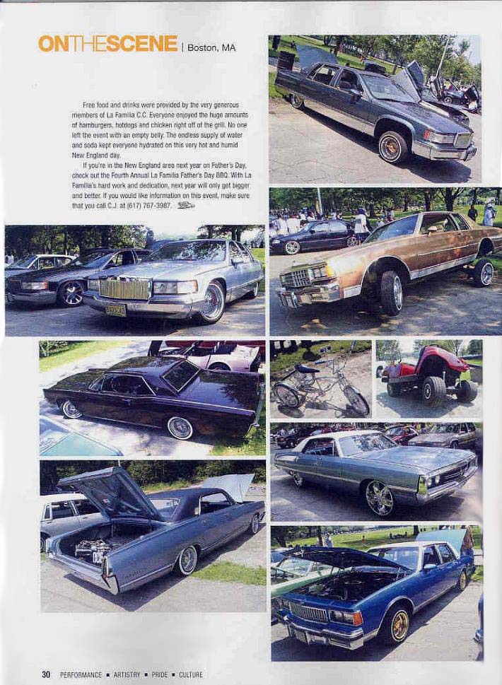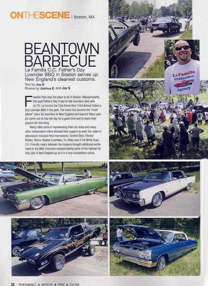 The Northeast Does It Again! (Click on images to read) The December 2006 issue of LRM was a special issue not only for our club since this was our 5th mention in LRM but all car clubs in the Northeast. A BBQ put on by La Familia Car Club that was held in Boston, MA this past June was featured in this issue of LRM in the On The Scene section. Jay of the Northern MA Chapter who attended this event worked with Josh of Twizted Stylz to put together a article and some pictures a few days following the event and it was looked over by CJ (a member of La Familia C.C.) before Jay submitted the article for publication. The article recognizes La Familia and CJ's efforts for this event and all car clubs and individuals that participated. We hope to continue the momentum with LRM and show all the readers how lowriders in New England can do great things with all car clubs and solo riders UNITED.