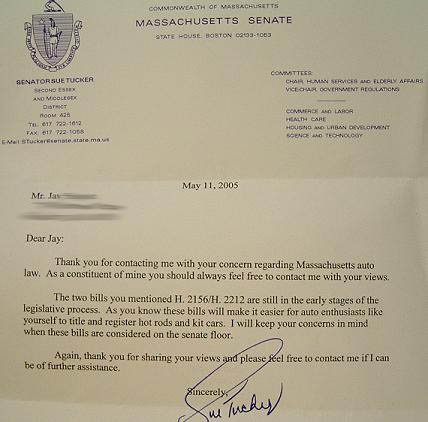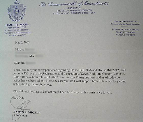 Contact your Massachusetts State Legislators in Boston immediately and request their support for this legislation. These bills strive to recognize and promote our hobby while providing fair and reasonable equipment standards for street rods and customs. If you need assistance in determining who your legislators are, please contact the Massachusetts State Legislature's General Information line: 617/722-1276.